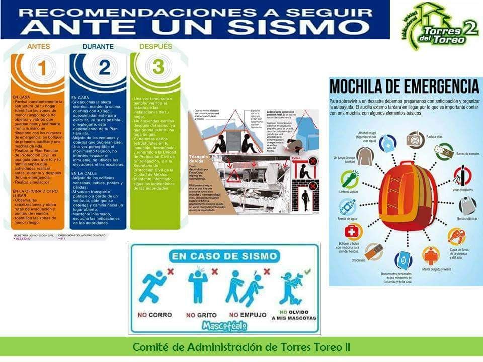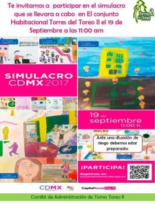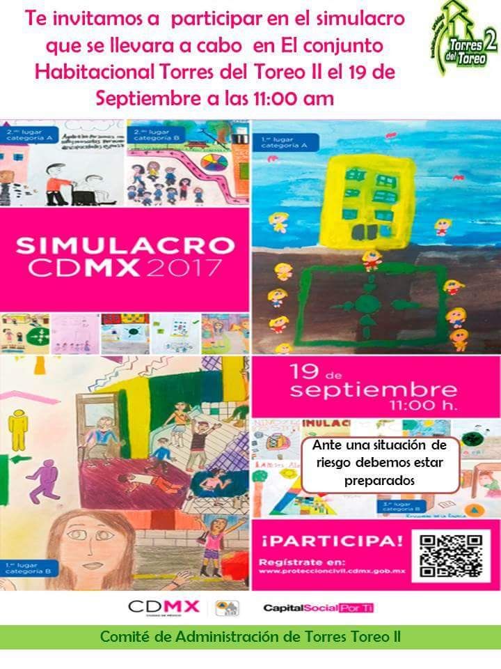 Les hacemos una cordial invitación para que participen en este simulacro ya que como les comentamos en asamblea, está información es muy importante que la compartan con sus vecinos y se conformen sus brigadas, este tema es muy importante para todos los habitantes de la Unidad, del mismo modo les comentamos que toda esta semana en las carpas café y blanca de 4:00 a 8:00 H estará personal de Protección Civil, apoyando con platicas y recomendaciones, para el simulacro a efectuarse el día mencionado, donde contaremos con diversas autoridades que vendrán a evaluar y corregir para salvaguardar nuestra vidas.
